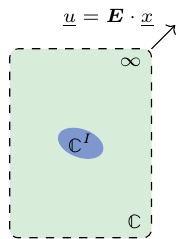 \(\uuuu{A}^E\) is called the strain-strain concentration tensor for the Eshelby problem and \(\uuuu{P}(\uu{A},\uuuu{C})\) is the Hill polarization tensor already introduced in Chapter 5, depending only on the shape and orientation of the ellipsoid \(\uu{A}\) and the matrix behavior \(\uuuu{C}\), not on that of the ellipsoidal inhomogeneity \(\uuuu{C}^\mathcal{I}\).