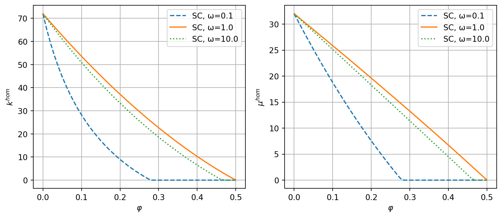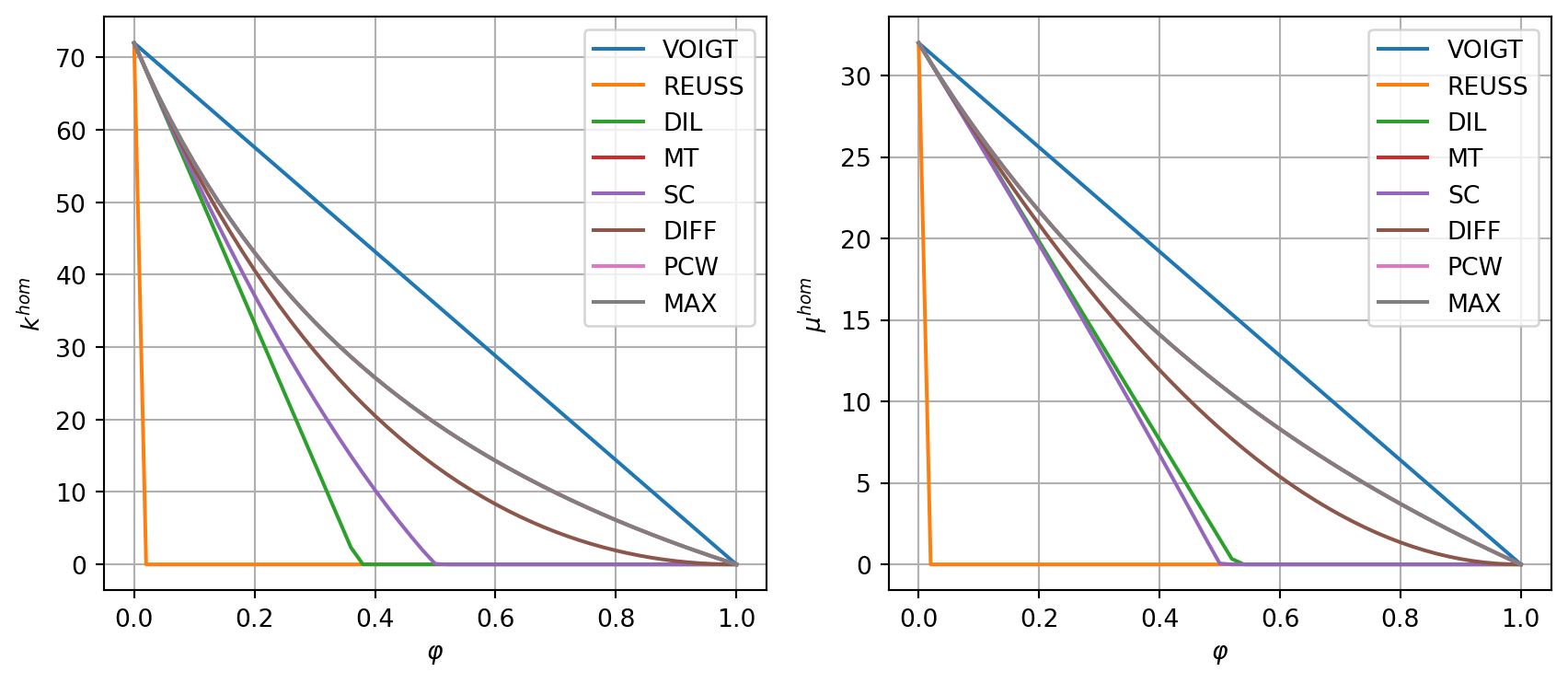 The following example computes the effective bulk and shear moduli versus porosity for all available schemes.
