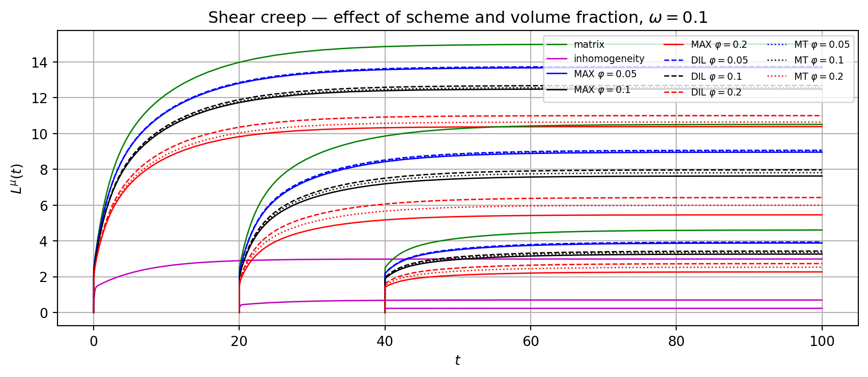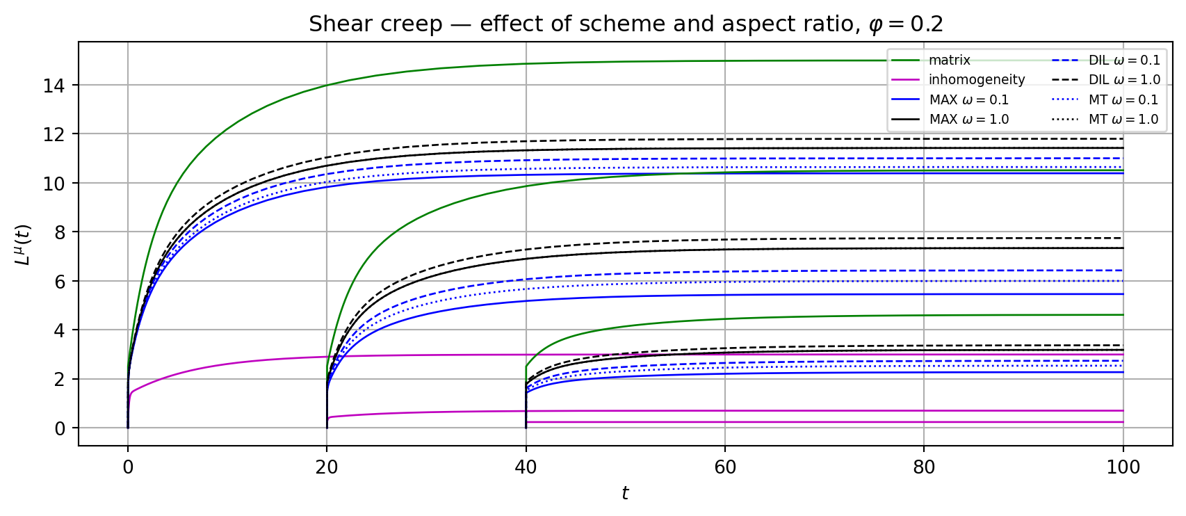 ax.set_title(r'Shear creep — effect of scheme and volume fraction, $\omega=0.1$')