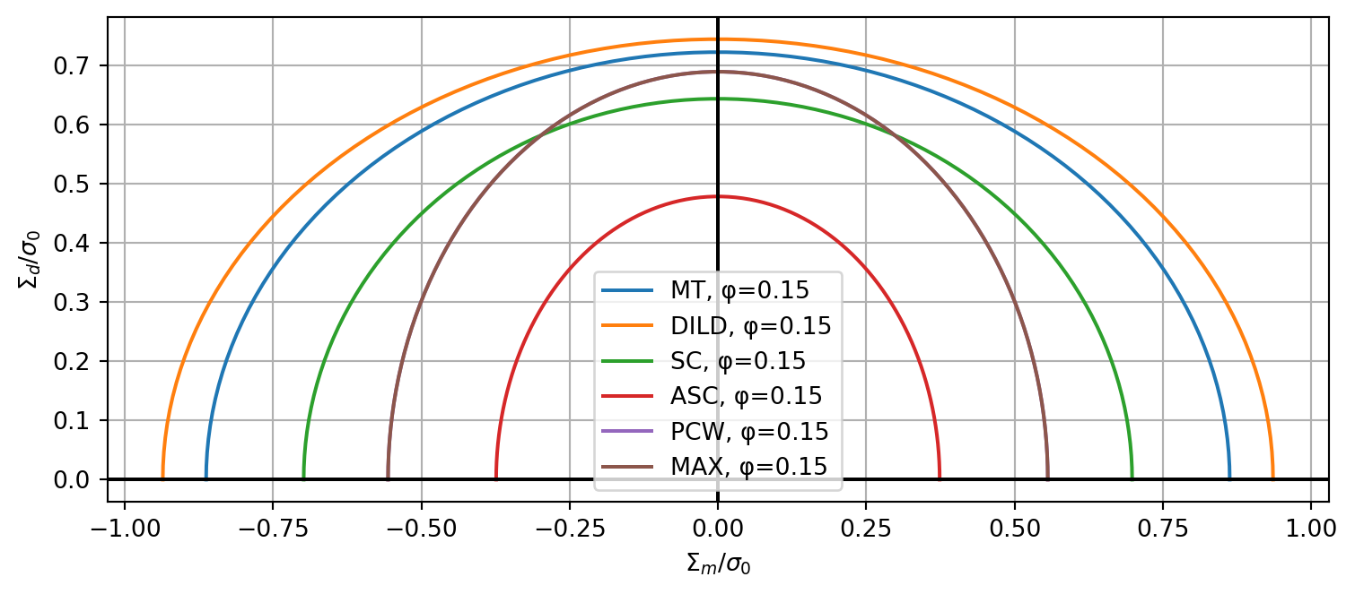 Using the second-order strain moments (see Section 18.1) and the Kreher–Suquet variational result (Kreher, 1990; Suquet, 1997), the macroscopic strength criterion can be expressed in closed form. For isotropic microstructures (using the derivative w.r.t. \(\mu_s\) only), the macroscopic criterion in terms of the mean stress \(\Sigma_m = \tfrac{1}{3}\mathrm{tr}(\uu{\Sigma})\) and deviatoric stress \(\Sigma_d = \sqrt{\uu{\Sigma}':\uu{\Sigma}'}\) is an ellipse: