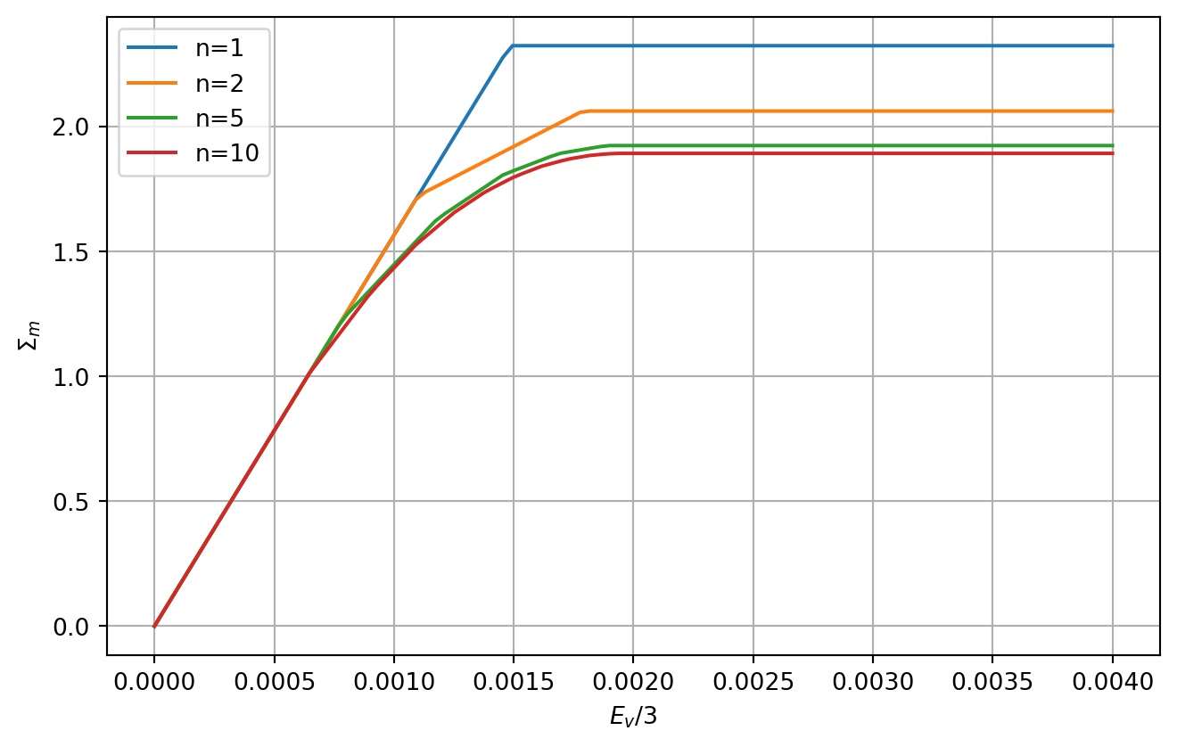 with \(E_v = \mathrm{tr}(\uu{E})\) the volumetric macro-strain and \(E_d^2 = \uu{E}':\uu{E}'\) the deviatoric macro-strain squared. The nonlinear problem is solved by a fixed-point iteration: the matrix is discretized into \(n\) concentric layers (via sphere_nlayers), each carrying a different secant modulus, and the self-consistent scheme is applied until convergence.