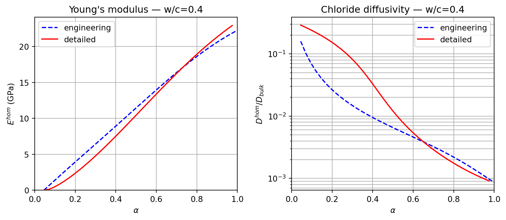 The volume fractions of the main phases are derived from Powers’ hydration model as functions of \(w/c\) and \(\alpha\) (Achour et al., 2020):