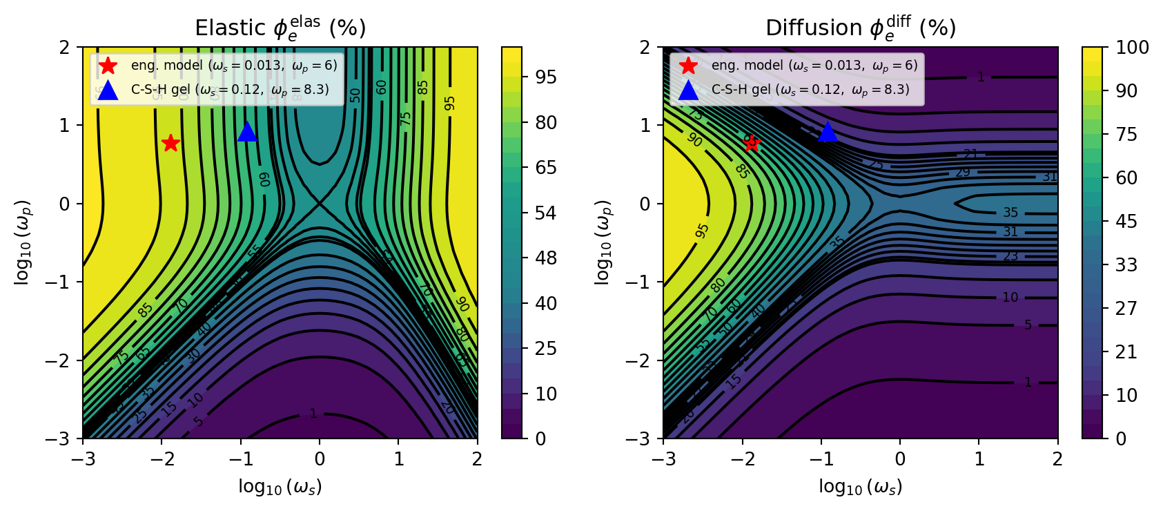 fig_d.show()The diagrams confirm the calibration rationale: with oblate solid (\(\omega_s \ll 1\)) and prolate pores (\(\omega_p \gg 1\)), the elastic and diffusion percolation thresholds are well separated — the solid skeleton percolates at high porosity (early hydration, low \(\alpha\)) while the pore network remains connected until very low porosity (late hydration). The engineering model calibration point (\(\omega_s = 0.013\), \(\omega_p = 6\), marked by \(\star\)) sits in a region where \(\phi_e^{\rm elas} \approx 15\,\%\) and \(\phi_e^{\rm diff} \approx 50\,\%\), consistent with reported setting degrees and with the experimentally observed diffusivity drop at intermediate to high hydration (Achour et al., 2020).